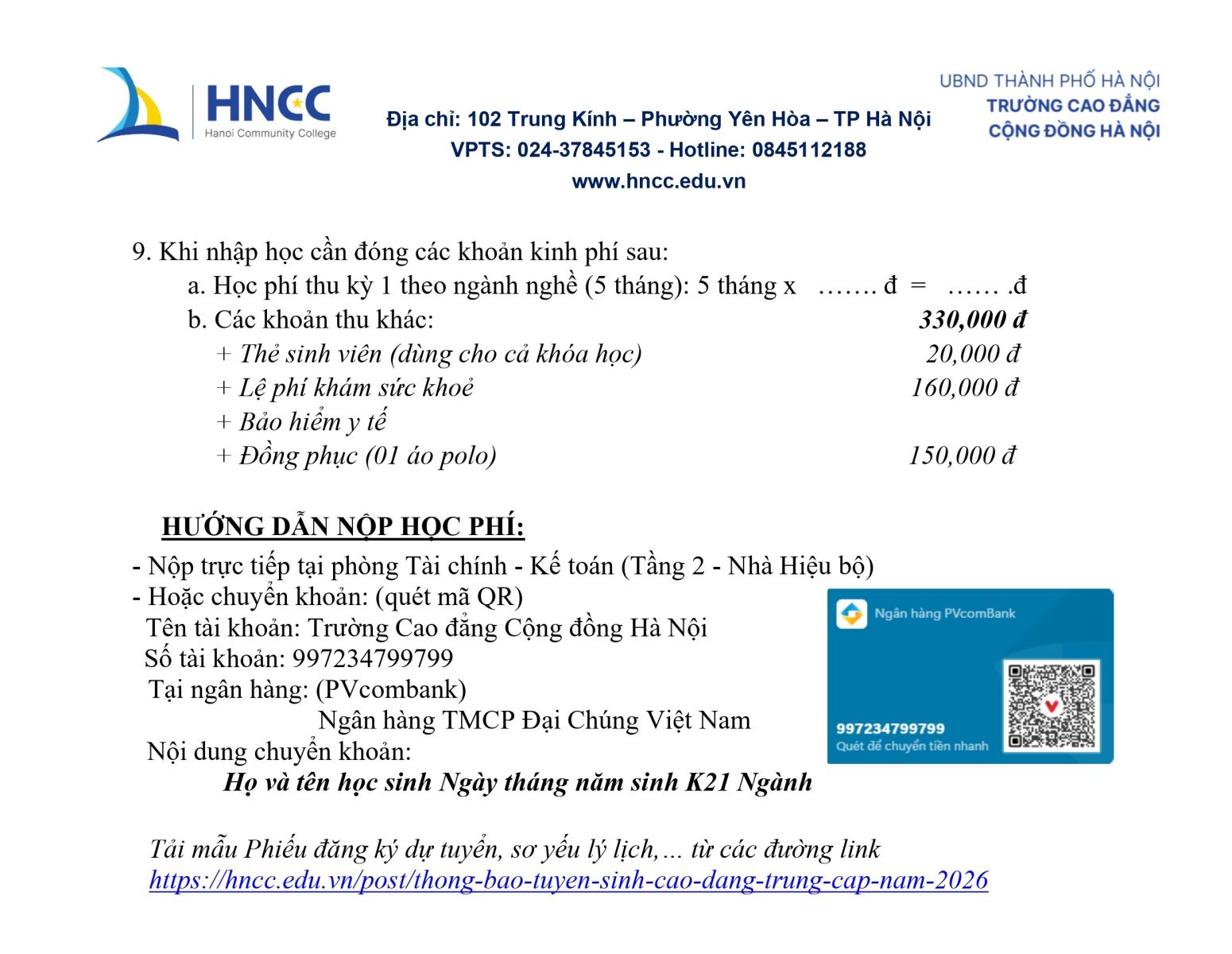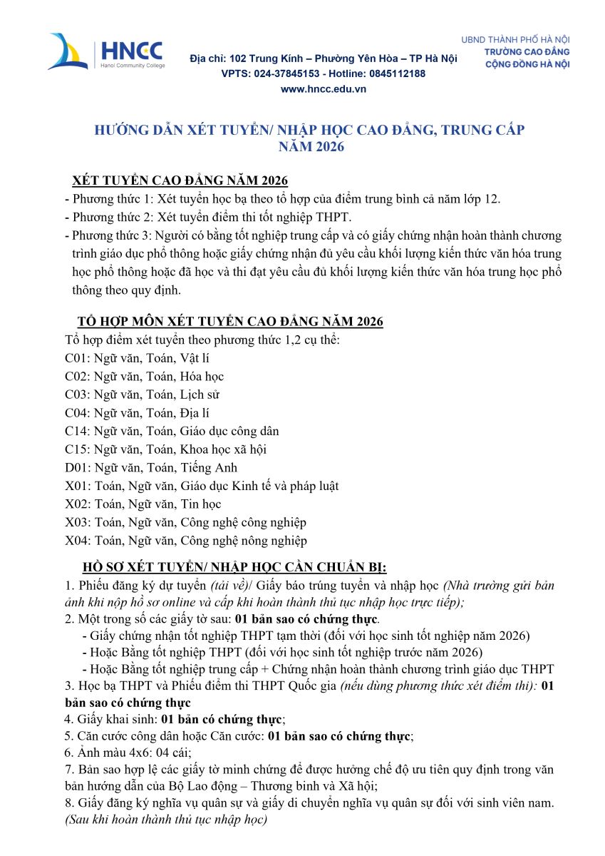 Hướng dẫn xét tuyển và Nhập học Cao đẳng, Trung cấp năm 2026 Xét tuyển online: Tại đây Xem học phí Hệ Cao đẳng: Tại đây Tải phiếu Xét tuyển: Tại đây VIDEO HƯỚNG DẪN XÉT TUYỂN VÀO HNCC CĐ Tags: Bài viết liên quan: Hướng dẫn thủ tục xét tuyển và Nhập học lớp 10 + nghề năm học 2026 - 2027