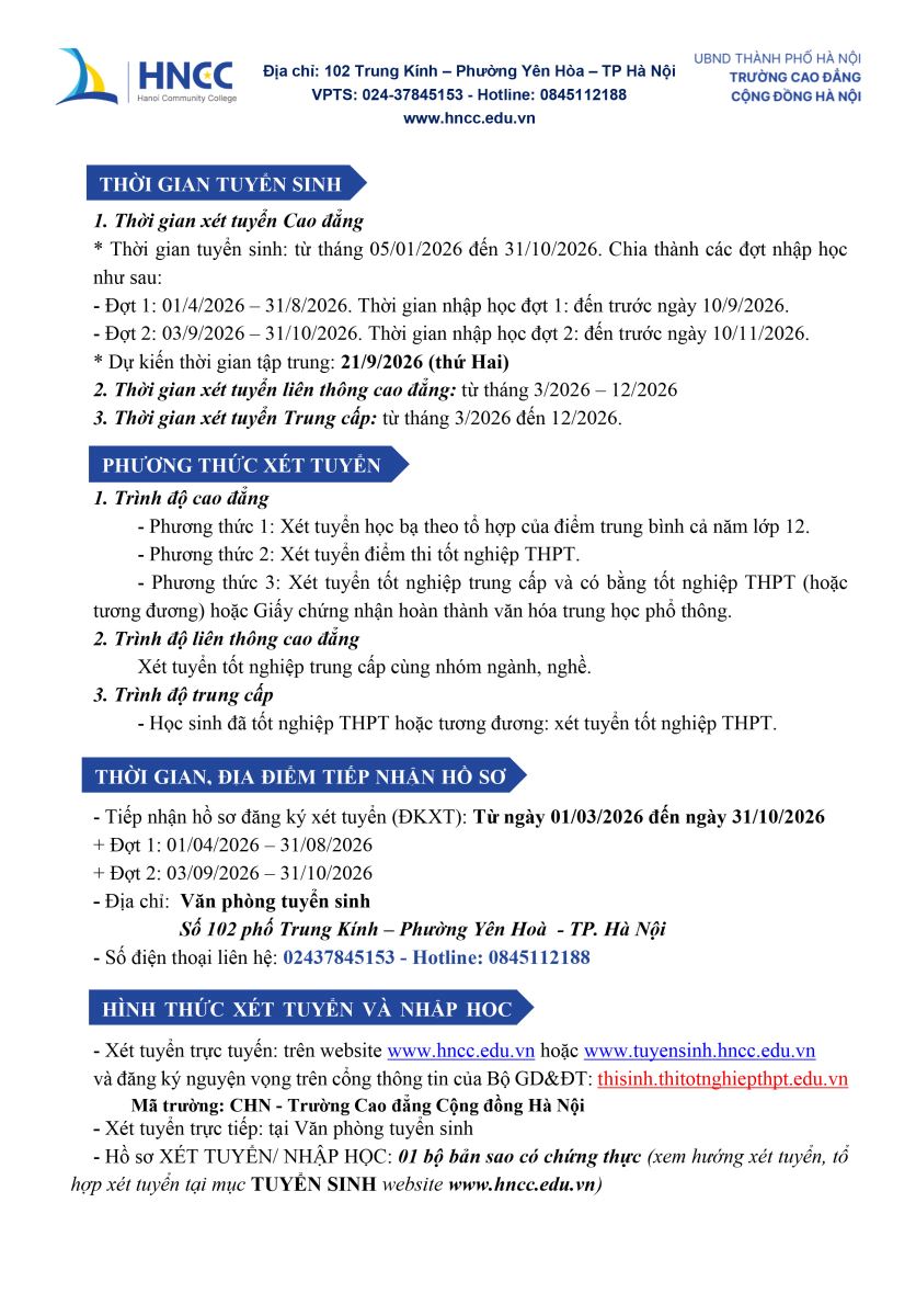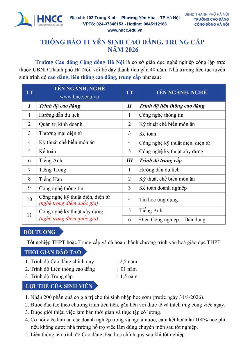 Thông báo tuyển sinh cao đẳng, trung cấp năm 2026 Link tải phiếu đăng ký: /Uploads/files/HNCC PHIEU ĐANG KY XT.docx Tags: Bài viết liên quan: Cập nhật các trường Cao đẳng xét tuyển học bạ ở Hà Nội 2025 ( Mới nhất) Thông báo tuyển sinh cao đẳng năm 2024 - Liên kết doanh nghiệp miễn phí đào tạo - thực tập có lương Thông báo tuyển sinh cao đẳng hệ chính quy năm 2024 Thông báo tuyển sinh ngành Chăm sóc sắc đẹp hệ cao đẳng chính quy năm 2024