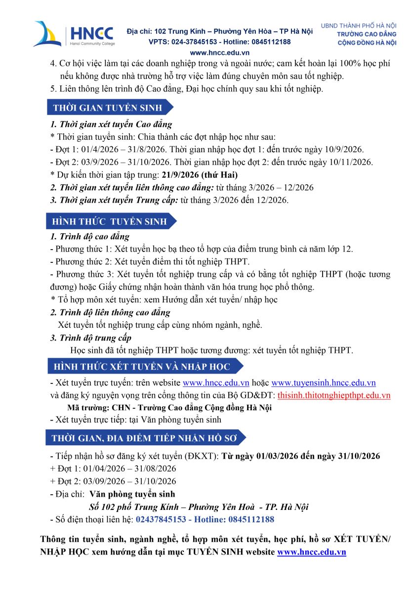 Thông báo tuyển sinh cao đẳng, trung cấp năm 2026 Link tải phiếu đăng ký: HNCC PHIEU ĐANG KY XT Tags: Bài viết liên quan: Thông báo tuyển sinh cao đẳng hệ chính quy năm 2024 Thông báo tuyển sinh ngành Chăm sóc sắc đẹp hệ cao đẳng chính quy năm 2024 Cập nhật các trường Cao đẳng xét tuyển học bạ ở Hà Nội 2025 ( Mới nhất) Thông báo tuyển sinh cao đẳng năm 2024 - Liên kết doanh nghiệp miễn phí đào tạo - thực tập có lương