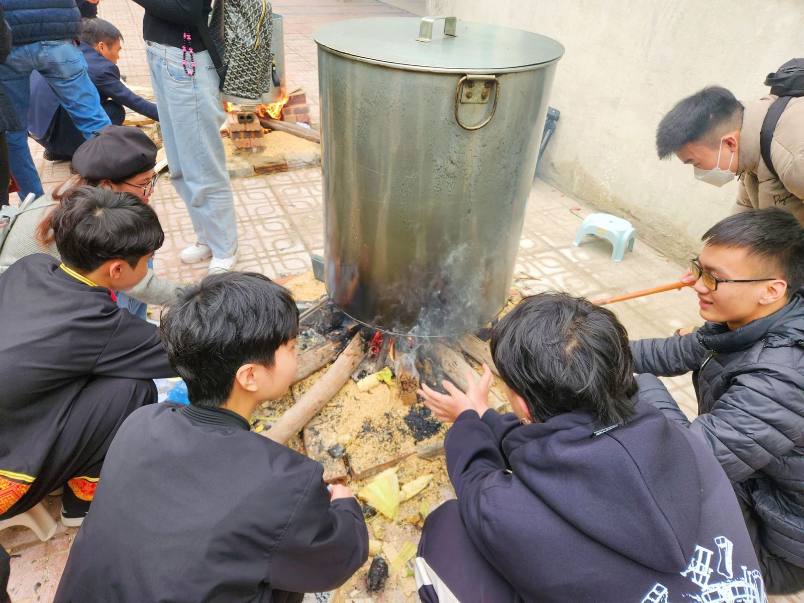 Không khí Tết truyền thống rõ ràng hiện hữu ở khắp mọi nơi, từ những chiếc bánh chưng xanh mướt đang được sắp xếp gọn gàng trên bàn, đến những tiếng cười vang lên từ các trò chơi dân gian truyền thống.
