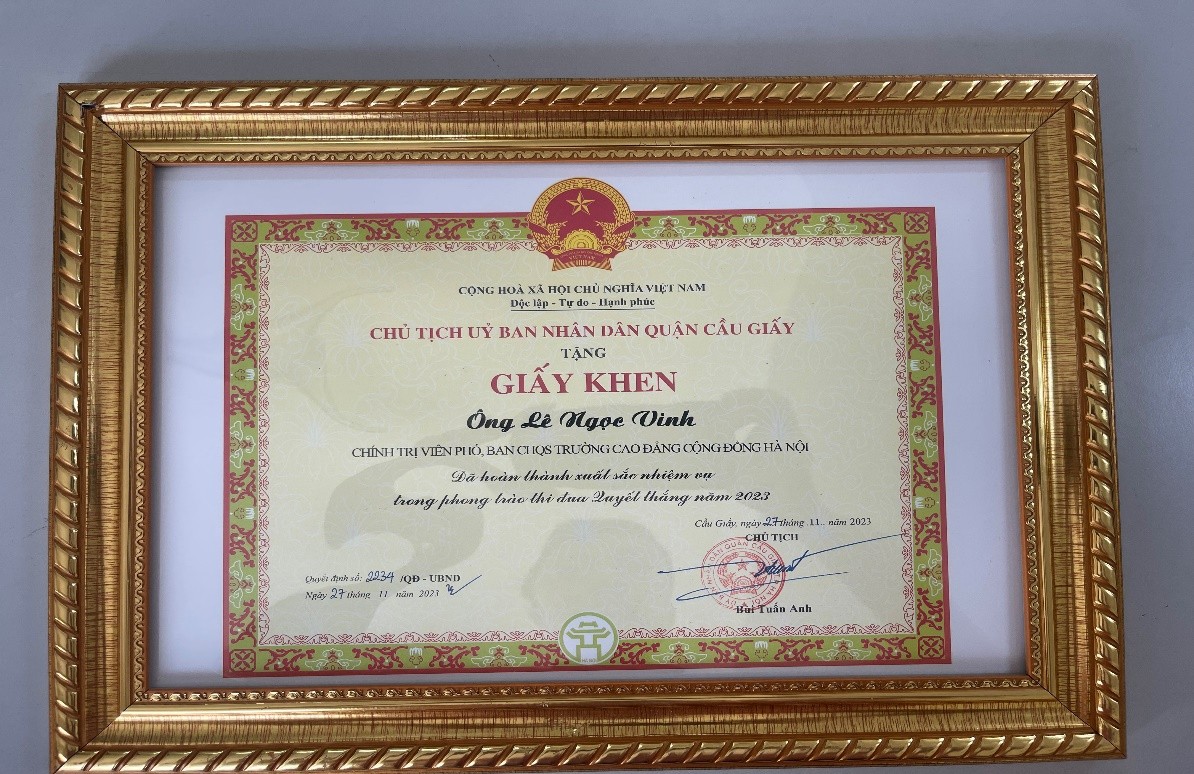 Với những cống hiến không ngừng nghỉ của mình, cũng trong năm 2023, thầy xuất sắc nhận giấy khen “Hoàn thành xuất sắc nhiệm vụ trong phong trào thi đua Quyết thắng năm 2023” của Chủ tịch UBND quận Cầu Giấy.